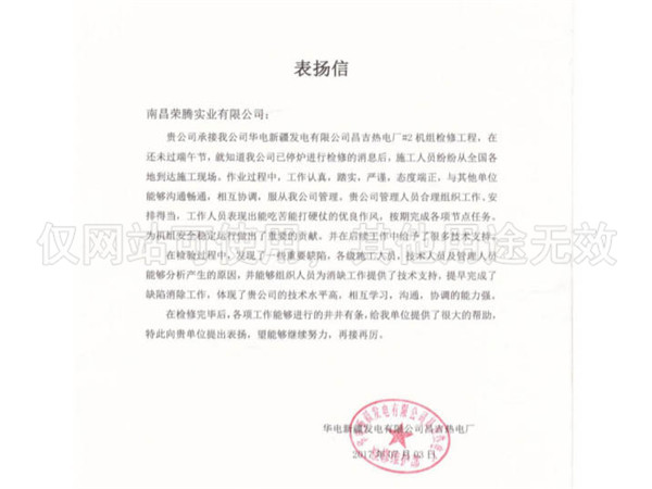 新疆昌吉電廠表揚(yáng)信